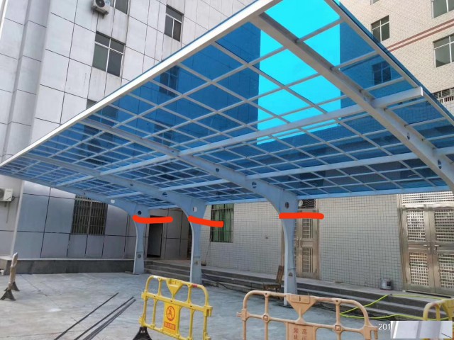 钢结构耐力板雨棚是一种一种高强度、透光、隔音、节能的新型优质装饰材料,比夹胶玻璃、夹丝玻璃、钢化玻璃、中空玻璃更具轻质、耐候、超强、阻燃、隔声的优良性能。阳光板在80 年代中期迅猛进进建筑装饰材料市场,因耐力板特有的高品质,得到建筑设计、装潢工程、环境工程、广告业的普遍认同。耐力板外表经过防紫外线工艺处理,耐力板具有透光性强、抗冲击、隔热、耐候、防结露、阻燃、隔声和良好的加工性能等。耐力板的抗冲击性为普通玻璃的 100 倍。具备抗老化性能,成功地解决了其它工程塑料所不能解决的老化问题;耐力板难堪燃一级资料。