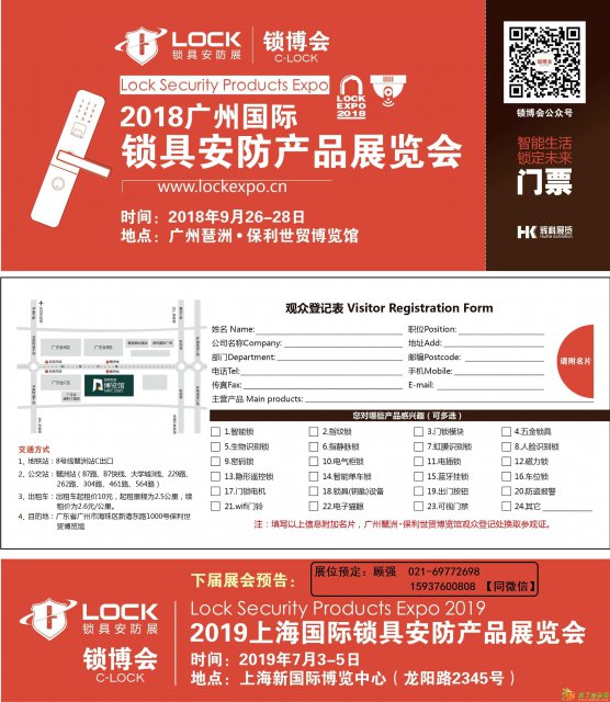 本次展会在广州琶洲-保利世贸博览馆举办,时间:9月26-28号,规模庞大,展品涵盖电子锁、智能锁、指纹锁、人脸识别锁、虹膜识别锁、指静脉识别锁及其它生物识别锁、机械锁、车辆交通用锁、安全防护产品、锁具配(附)件及相关技术设备等。并同时组织各领域的专业客户到场观摩、参与。将邀请专门组织国外相关机构、采购团到会,预计有万余家客户莅临现场,专业观众超过5万人次。