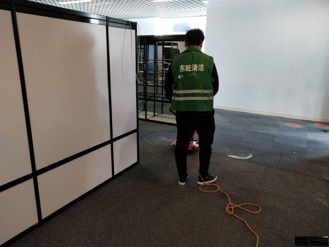 1、用吸尘器全面吸尘;2、局部处理即是用专用的清洁剂在地毯上边油渍、果渍、咖啡渍单独进行处理;3、稀释地毯泡沫清洁剂,注入打泡箱;4、用手刷处理地毯边缘、角落和机器推到之处;5、用装有打泡器、地毯刷的单盘扫地机,以干泡刷洗地毯;6、作用一会儿,然后重复;7、地毯梳或耙梳起地毯纤毛,这对地毯外观非常重要,尤其是纤维较长的棉绒地毯,而且有加快地毯干燥作用;8、让地毯毛完全干透;9、用吸尘器吸去污垢和干泡结晶体。
