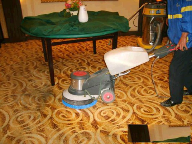 清理地毯表面杂物,对重点污点做重点处理。根据地毯脏度,按情况稀释药剂,配合刷地机及刷盘清洗地毯并用吸尘吸水机吸干。用全能清洁剂适量配合刷地刷洗地毯,并吸干。然后蒸汽机对地毯进行高温杀菌、梳理。最后风机吹干,并喷洒适量的空气清新剂。