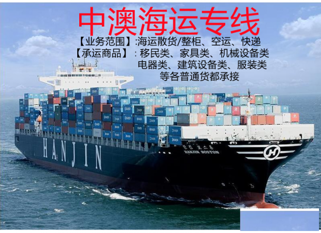 【中国到澳洲海运的操作流程】1、询价:向客服确定商品是否可以运输,询问收费标准及包装注意事项。2、入仓:按照客服给定的收货地址,发货到我店仓库。货仓无需进仓费,提供长达30天免费仓储。3、出货:货物入仓齐全,我们发出装箱清单给客户,客户将发件人、收件人和货物的相关资料,填写在装箱清单上并发回。收到相关资料后,安排报关装柜出货。 (个人或公司名义均可收货)4、结算:客服在出货后会提供费用明细,客户对费用确认并支付。5、派送:货物到港清关完毕后,会安排派送到门。【增值服务-您值得拥有】VALUE-ADDEND SERVICES1:仓储配送(仓储,可上门提货);2:分拣/贴标签;3:起运港/目的港货物集散;4:木包装熏蒸/打托盘;5:货物运输状态的查询您可以直接将物品寄到我司仓库,也可以在购物网站上或者厂家选购好了之后,收货地址直接填写我司仓库地址,货到仓库之后可以免费帮您签收,拍照和核实货物情况。【中国到澳洲海运时间】中国到澳洲悉尼,墨尔本的船期大约25天左右中国到澳洲布里斯班的船期大约25天左右中国到澳洲阿德莱德的船期大约30天左右中国到澳洲珀斯的船期大约30天左右中国到澳洲堪培拉的船期大约25天左右【出口优势货物】家具、行李、床垫、厨具餐具、装饰画、大型机器、窗帘、地毯、装修材料、自行车、家用电器、衣服、鞋子、包包、行李、玩具,食品等