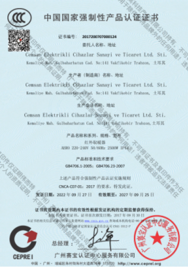 另外,伟而特红外电暖器获得了中国CCC认证。CCC认证是中国强制性产品认证制度,其标志代表着产品通过了中国的安全标准和质量要求。对于伟而特红外取暖器来说,CCC认证是进入中国市场的必备条件,也是对其产品质量和安全性的充分认可。