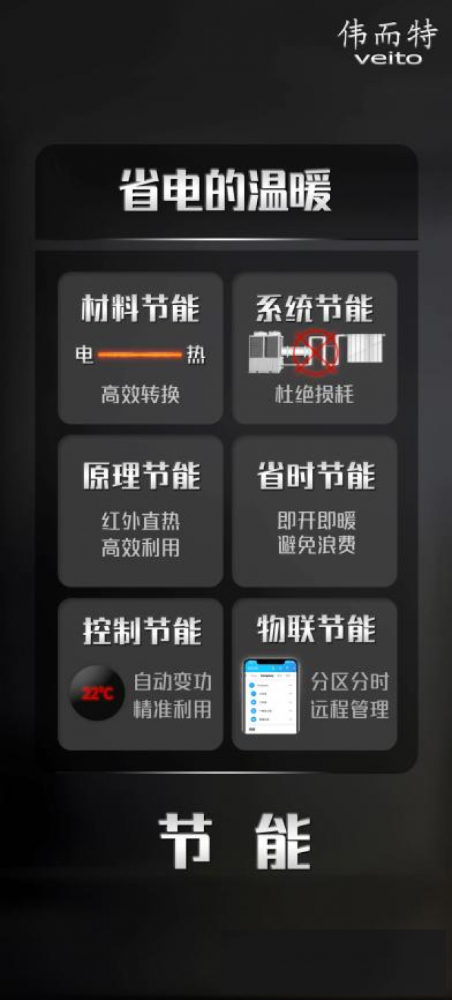 系统节能:减少传输损耗:传统供暖系统通过管道等传输热量,过程中易产生热量散失损耗。伟而特红外供暖依靠红外辐射传递热量,无需复杂管道传输系统,如图中以红色叉号标注的管道部分,直接从发热源将热量辐射到室内空间,减少了传输环节的能量损耗。精准控制能耗:它可实现精准的温度控制。依据室内实际温度需求,智能调节红外辐射的强度和范围,避免能源浪费。当室内温度达到设定值,系统能及时调整输出功率,降低能耗,达到节能目的,如同图中所表达的杜绝损耗理念。
