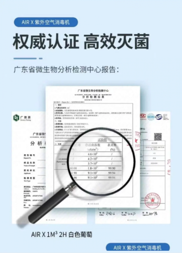 伟而特空气消毒机的杀菌能力得到了国家空气净化产品质量检验检测中心和广东省微生物分析检测中心的权威认证。检测报告显示,其对白色葡萄球菌的灭活率高达>99.94%,充分证明了其强大的消毒效能。峰值波长为253.7nm的紫外线被科学证实为杀菌作用最强的波段,能够高效灭活空气中的细菌、病毒(包括新冠病毒)等病原体,为我们提供真实有效的防护。