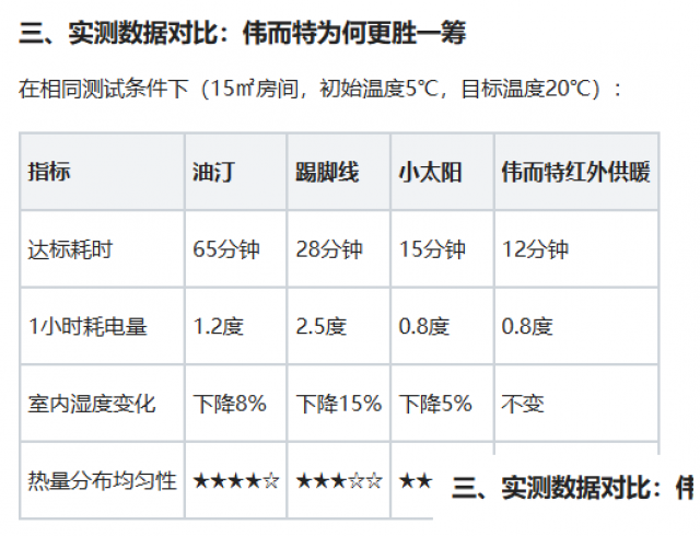 数据显示,伟而特在能耗控制上优于除小太阳外的所有品类,而在舒适度方面则全面领先——既没有小太阳的局部过热问题,又避免了踢脚线的高噪音困扰。