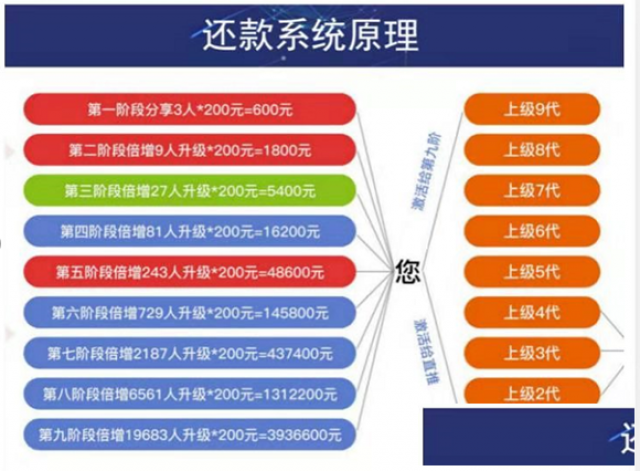 当你升级第九阶段时帮助上9代400元,您可收到您下9层19683个200元=3936600元。