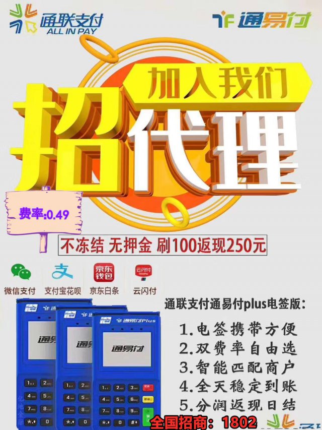 通联电签POS:支持微信、支付宝、花bei、刷卡、插卡、闪付、银联云闪付、NFC多方式交易、更便捷。