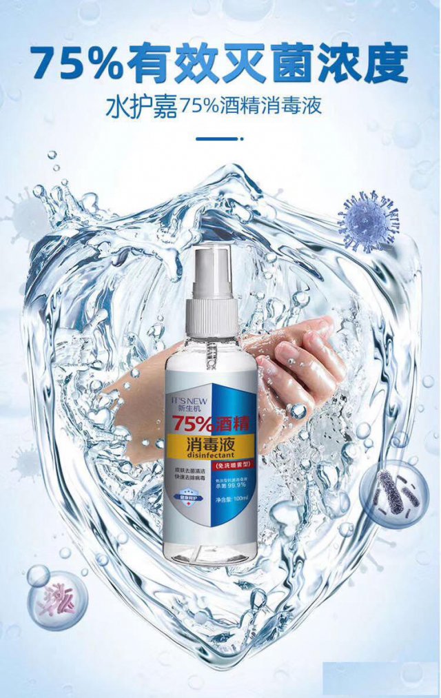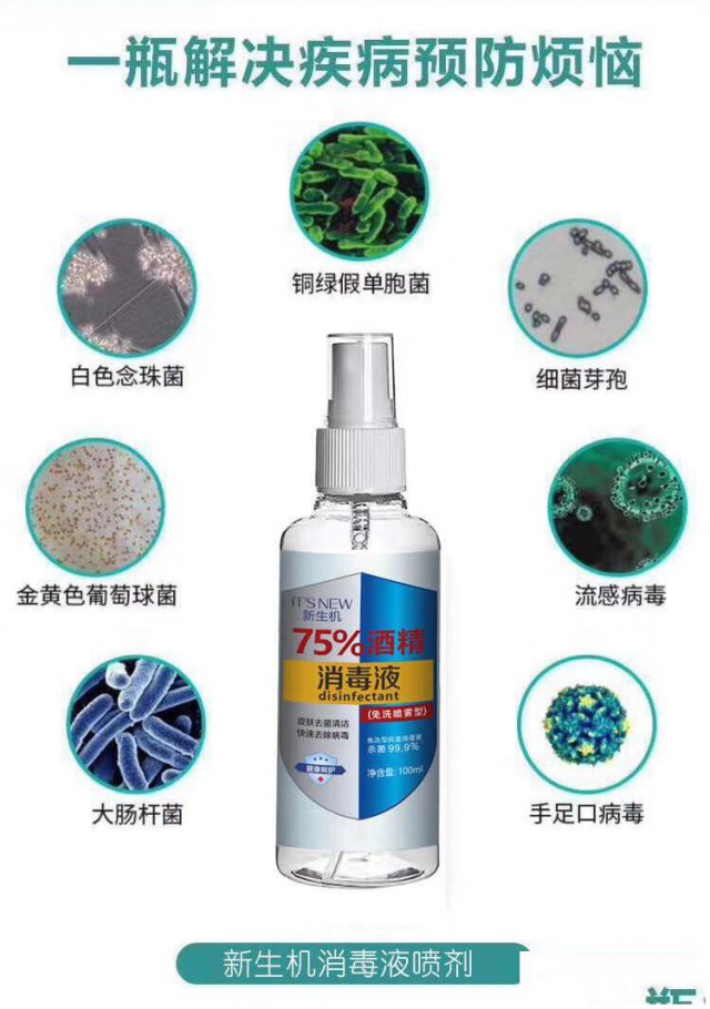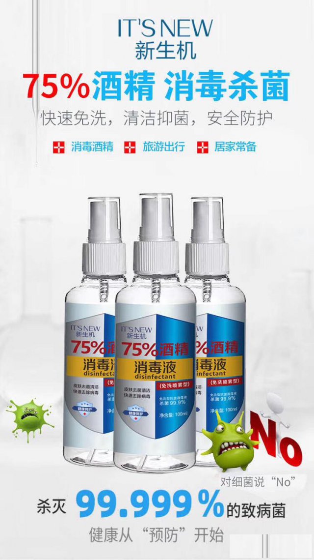 新生机75%酒精喷雾主要的有效成分是乙醇,酒精含量75%±5%,完全能够达到李兰娟院士介绍的酒精标准。它主要是作为个人护理,能直接接触皮肤,洗手的时候喷一下,基本能杀灭市面上常见的病菌,而且使用后能持久抑菌,保持干净没有残留。出门上班的你们,除了必备的口罩外,当然还有一样不可或缺就是75%酒精!因为目前病毒的主要传播,除了口鼻的直接吸入,还有手部接触!纳米喷头,瓶身小巧,随时消毒 这款消毒喷雾,采用最新型纳米小喷头设计,轻轻一按,就能喷出细腻均匀的水雾,用量更省,覆盖面积更广,杀菌抗病毒效果更好!消毒抑菌更重要!但很多情况下,身边也不一定有水源所以一款免洗的酒精喷雾就非常实用!喷在手上搓揉,瞬间洁净,迅速风干。选择一款有效防护又亲肤的消毒剂!为自己带上一瓶,也为身边重要的人备着吧,保护好自己和家人的健康。例如用沾上病毒的手去揉眼、揉鼻,甚至是用手捏食物。国家卫健委高级别专家组成员李兰娟院士在记者会上透漏了病毒的“弱点”!!75%乙醇喷雾可以有效消灭活病毒,病毒怕酒精、不耐高温。这款消毒剂瓶身的设计很小巧、易拿。重点是免洗!在需要勤洗手的特殊时期,真的很实用,要预防细菌病毒,就不能马虎,选择一款放心的产品很有必要。平时上班也好,需要在外用餐也好,放在衣兜中、随身的包里,也不占位置,几乎随时随地,拿出来喷洒都很方便。