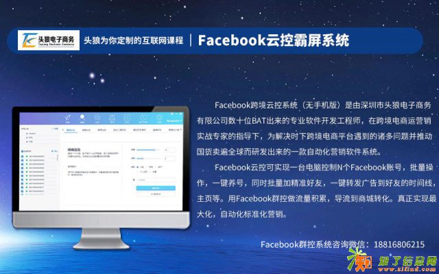 头狼Facebook群控精准营销系统由深圳头狼电商跨境专家组联合来自曾任职于BAT的技术团队共同开发。一台电脑控制1000个Facebook账号,掌管500万个粉丝。运用高科技算法,大数据分析,实现自动发帖、精准加友、智能互动、定时执行,利用Facebook精准营销,只加对本行业感兴趣的用户,吸引精准流量,提高成交概率。适用于所有行业,服装、皮具、汽配、家居、3C、宠物用品、日用品、工业机械、设备制造、化工制品、化工原料、电器、户外用品、护肤美妆、珠宝首饰等。帮助各类跨境电商提高流量,如亚马逊、速卖通、阿里巴巴国际站、eBay、wish、shopee、自建站(shopify)
