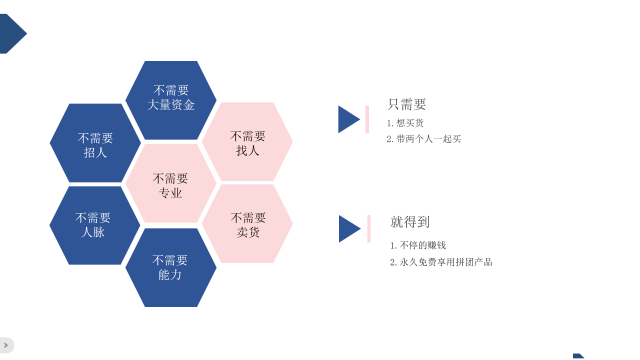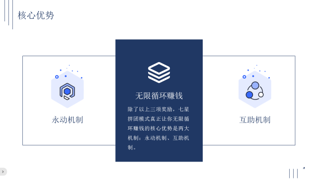 七人即拼模式在人数上设置限制,以七人为一个团,不强制用户发展下线,规避了法律的风险。使平台在合法合规的情况下运营。