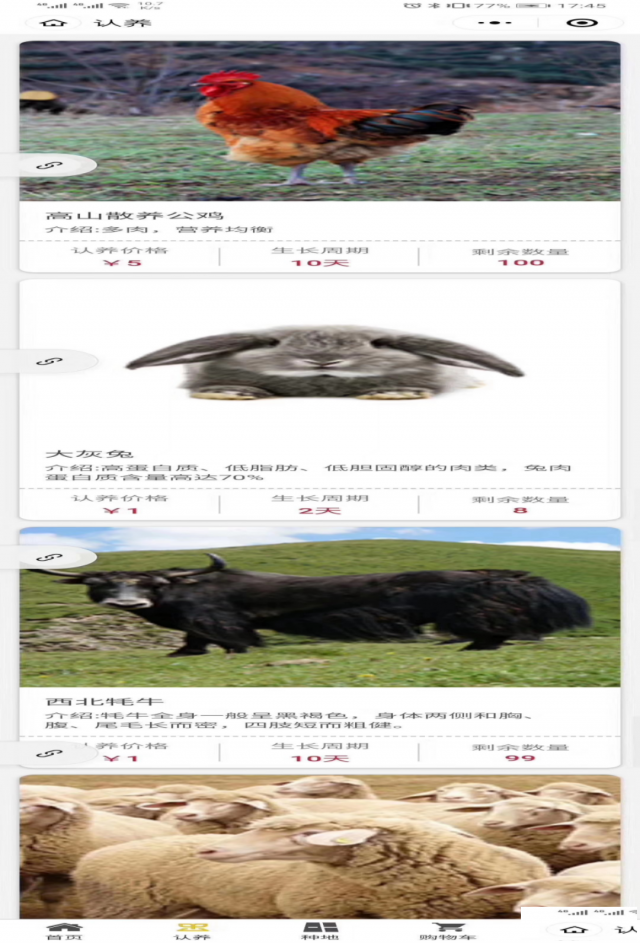 智慧农场推出畜牧领养,领养鸡鸭,猪牛羊等。认养鸡苗。喂养14个月左右,领取360