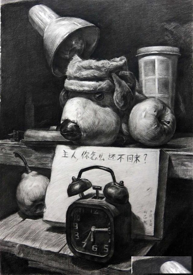 静物阶段则是训练我们的观察能力,绘画一些我们身边常见的物体,练习不同质感,不同纹理的物体,能够达到见到一个东西就可以基本上了解其结构,将此物体画下来的能力。