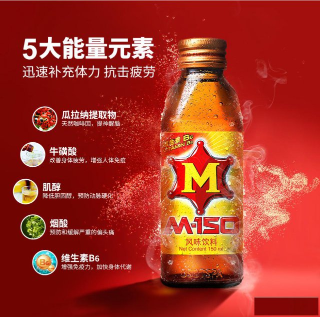 M-150作为一款能量饮料,富含五大能量元素,包括瓜拉纳提取物、牛磺酸、肌醇、烟酸和维生素B6,能帮助人体迅速补充能量、提神醒脑。