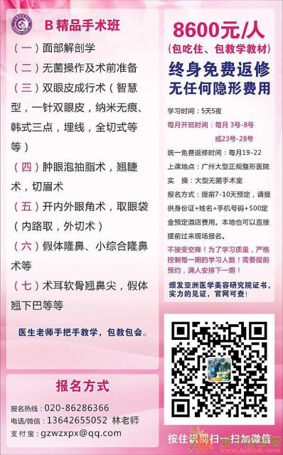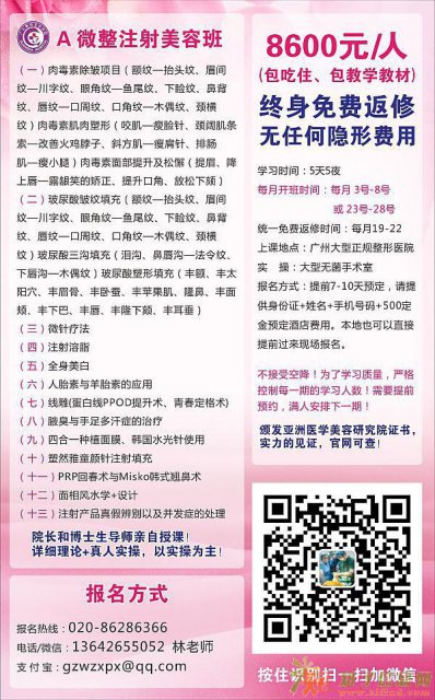 广州广大微整形培训学校是专业微整形培训机构,是高端整形技术人才的摇篮。多年以来,凭借强大的师资阵容、一流的技术和先进的教学手段,为我国的微整形职业技能人才培养做出了杰出的贡献。微整形培训中心怎么选,首选广大微整形美容医院!如果您还有其他问题需要咨询,欢迎拨打热线电话进行详细咨询。 林老师 微信:8059094