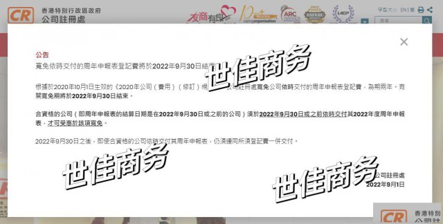 根据注册处2022年9月1日发布的公告,于2020年10月1日生效的《2020年公司(费用)(修订)规例》,公司注册处宽免公司依时交付的周年申报表登记费,为期两年。有关宽免期将于2022年9月30日结束。