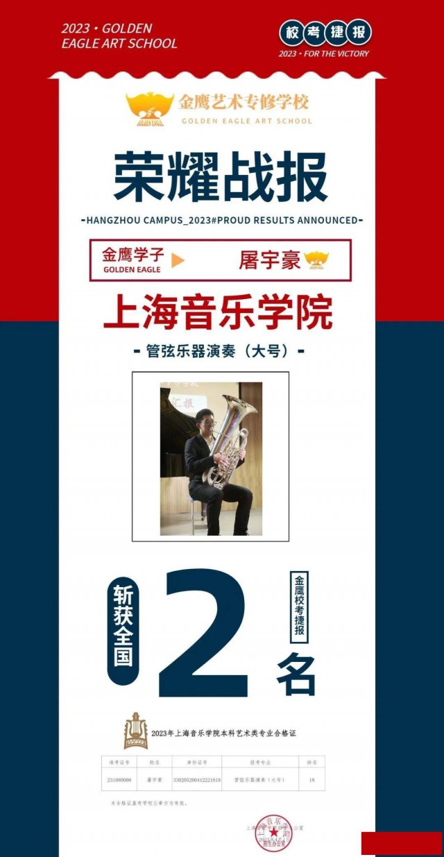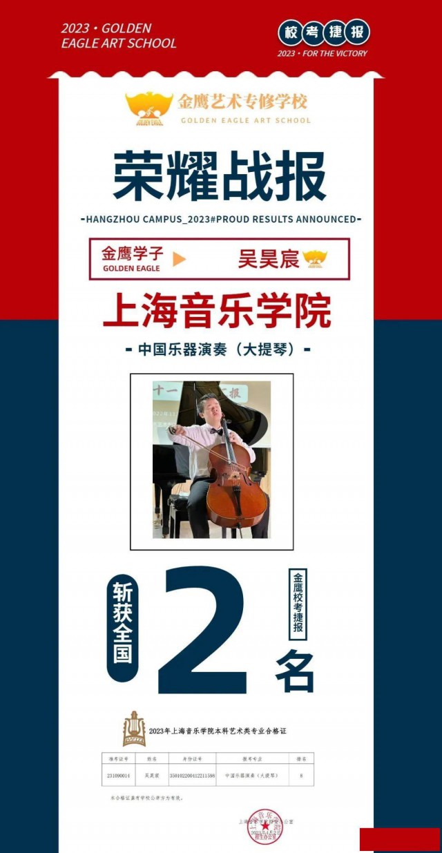 金鹰艺术专修学校拥有稳定优秀的教师资源,良好的学习氛围,人性化的管理制度,完善的教学体系,全方位的升学规划服务。2022届学员蒋沛延荣获中国顶级学府中央音乐学院音乐治疗专业全国第一的优异成绩,2023届学员也是奋勇直追,目前已有屠宇豪、吴昊宸两位学员拿到了上海音乐学院管弦乐器演奏(大号)、中国乐器演奏(大提琴)全国第二的好成绩。相信陆续还会有更多捷报传出。