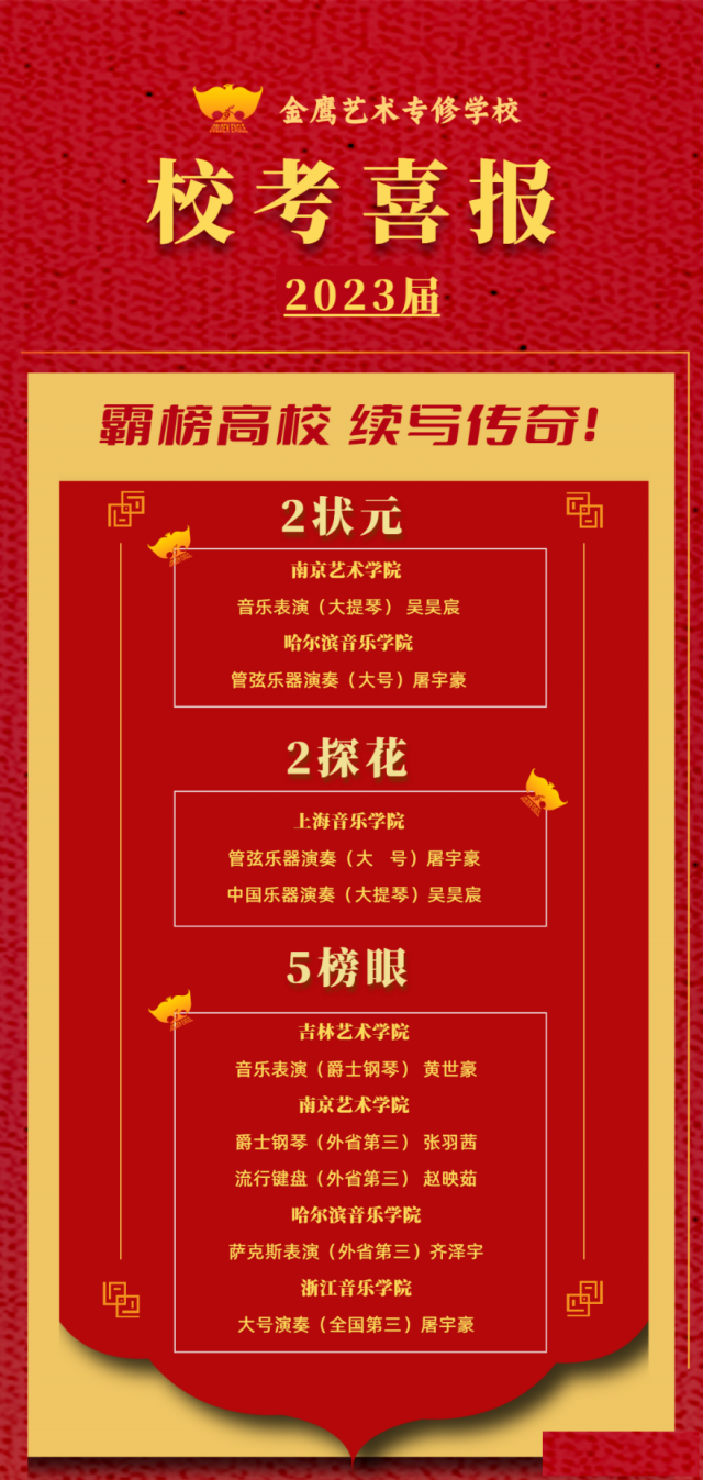 金鹰从未忘记自己真正的使命。2023年校考成绩揭晓,金鹰再次霸榜归来。我们共有53人参加校考,女生32人,男生21人。截止目前,已有48人拿到合格证,共计斩获107张合格证。上海音乐学院参考2人,斩获2张合格证,且2张均是探花(全国第2名);中国音乐学院参考1人,斩获1张合格证;中国传媒大学参考2人,斩获3张合格证;哈尔滨音乐学院参考2人,斩获2张合格证,并勇夺状元(外省第1)和探花(外省第3)殊荣。其他15所音乐院校参考40人斩获99张合格证!(院校陆续放榜中,榜单将持续更新)