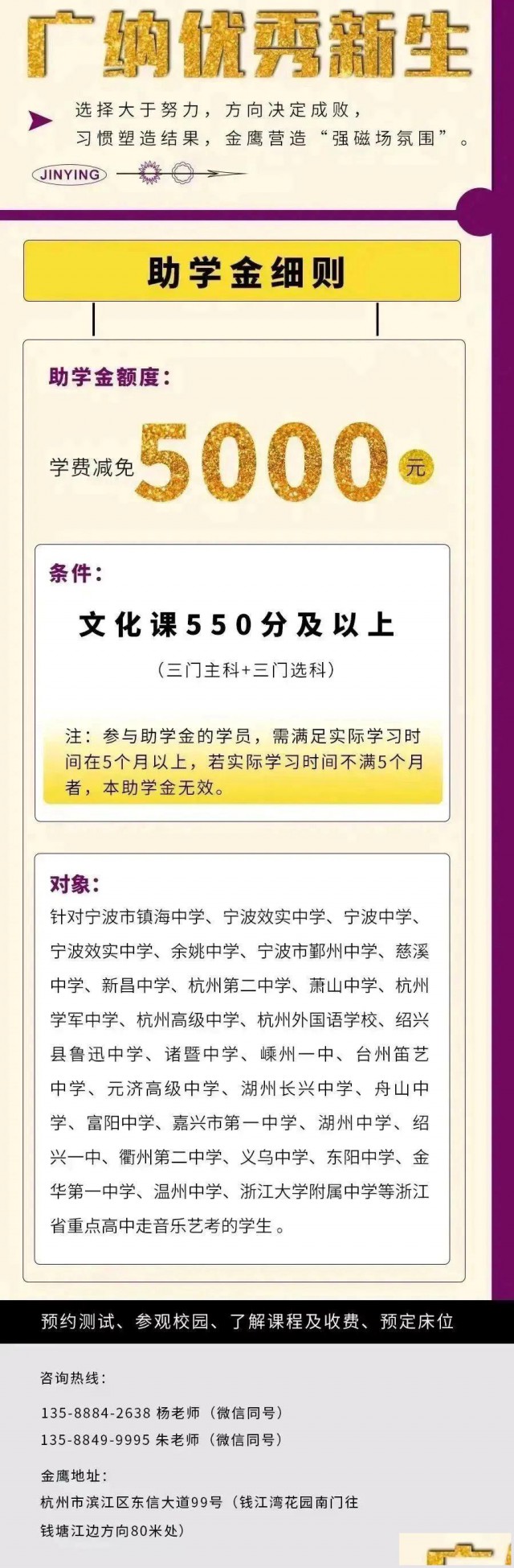 时光若白驹过隙,俯仰之间,金鹰即将敞开怀抱,迎接2024届新生的到来。进军的号角已经吹起,攻关的战鼓已经擂响。让我们拿出迎难而上的勇气,扬鞭策马,勇往直前,用勤奋和坚持铺平通向成功的道路,用拼搏增强跃上金榜的实力!
