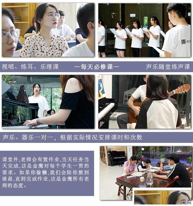 蒋沛延:刚来金鹰的第一天非常的焦虑和社恐。这是我第一次离开家这么远去求学,面对的是完全陌生的同学和老师,让我一下子感到十分不适应。还记得我来的第一天下午一个人坐在教室最后一排不知道干什么,只好自顾自刷数学试卷。父母叮嘱我一定要努力,所以我用尽我所能去做提升我自己的事。吃晚饭的时候回到寝室,当时头发还是雾蓝色的开门老师问我在哪里打饭,我才说了第一句话,后面渐渐的就和寝室里的室友熟悉了起来,成为了一辈子的兄弟。第一节钢琴课,我的手型完全走样,练了很久才勉强能立得住手指,说实话对于我来说真的很煎熬。每天在琴房里一遍一遍练着高抬指敲着全是白色的琴键,对于一个弹惯了野琴的人来说真的是一种折磨。我的钢琴老师李老师真的帮助了我很多,让我改掉了手腕下塌的毛病,让我的手指灵活性变得更强。第一节声乐课,作为一个声乐小白,我很不自信。周校让我唱几首流行帮我找找乐感,并且告诉我一切皆有可能,让我要有信心联考打到80以上。从一开始的大白嗓到现在挂胸腔的B,放在那时我真的不敢想。视唱课唐老师和金老师给了我很多帮助,让我从0起步,最终在联考拿到96分。练耳对于我而言本身并不是一件难事,文老师更多给予我在钢琴方面的意见和指导也是非常宝贵的。还有练声课的刘老师教我们做的气息训练、舞台表演课王老师教我们如何在舞台上表现等等,让我一个什么经历都没有人的人,收获颇丰。作曲一直是我的目标专业,作曲薛老师和和声洪老师两位老师给予了我很多我从前所从未了解的专业知识,仿佛开启了新世界的大门,让我从一个野路子的作曲爱好者逐渐有了理论的支持。杨校总在我迷茫的时候给我方向,让本来有“选择障碍症”的我勇敢地做出了一次又一次选择,最终一步步走到今天。