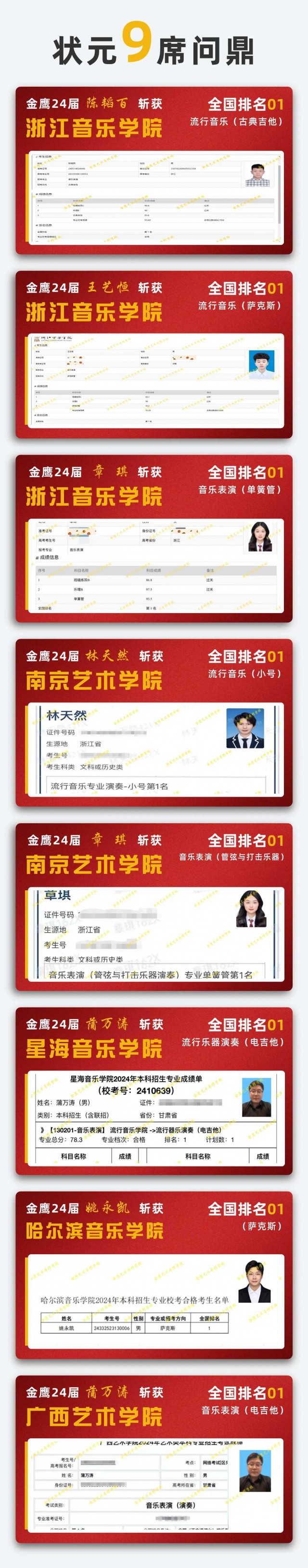 豪取音乐艺术院校9状元。