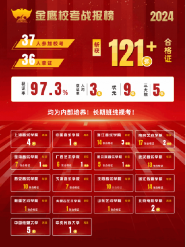 获证率97.3%,人均拿证3张,其中,三大院校再添5席,豪取音乐艺术院校9状元。
