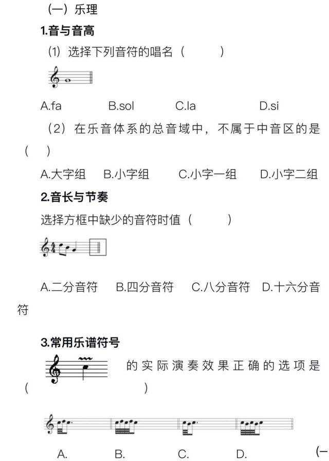 2.考试内容:音与音高、音长与节奏、常用乐谱符号、音程与和弦、民族调式与大小调式。
