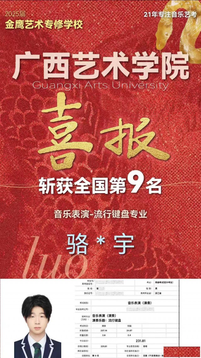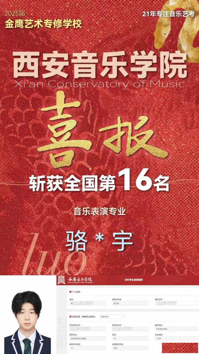 好在通过一段时间集训,孩子逐步适应进来。随着目标逐渐的清晰,动力也越来越足。知道了自己要考什么专业,要去什么样档次的学校。正所谓兴趣是最好的老师!兴趣+目标+正确的考学规划引导+自身的努力,事半功倍,最后的上岸也是必然的结果最终拿下了南京艺术学院、西安音乐学院、广西艺术学院的合格证。