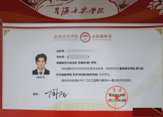 在全国校考中,张同学依然破除万难,稳定发挥,初试报考了11所院校,其中8所进入复试,7所学校进入终试;最终斩获音乐艺术院校合格证6张,选择了他心仪的星海音乐学院报考并录取。