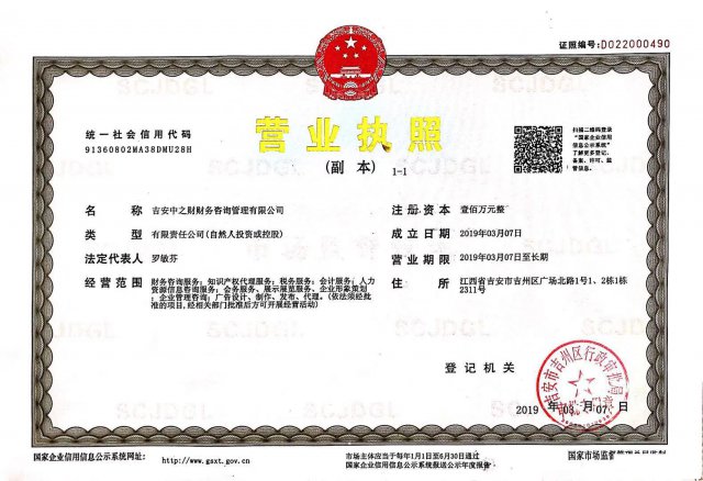 吉安中之财财务是一家以工商代理、财务代理、商标注册、专利申请、许可代理为主营业务的专业商务服务企业。