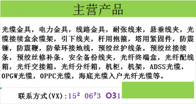 ADSS/OPGW光缆,光缆金具,电力金具,线路金具,耐张线夹,悬垂线夹,光缆接续盒,余缆架,引下线夹,杆用抱箍,塔用紧固件,防震锤,防震鞭,防晕环,接地线,预绞丝护线条,预绞丝接续条,预绞丝修补条,安全备份线夹,光纤终端盒,光纤配线箱,光纤交接箱,光纤分纤箱,机柜,机架,ADSS光缆,OPGW光缆,OPPC光缆,海底光缆等。