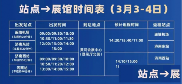 为了提供更好的服务,组委会特设立免费接送站服务,路线分别为:遥墙机场、济南东站、济南站、济南西站至济南黄河国际会展中心,30分钟/班次(准时出发),展馆到指定酒店,我们提供了多种交通路线供您选择。旨在为您提供方便、舒适的交通服务,让您能够更加专心地参与展会,享受完美的参展体验。