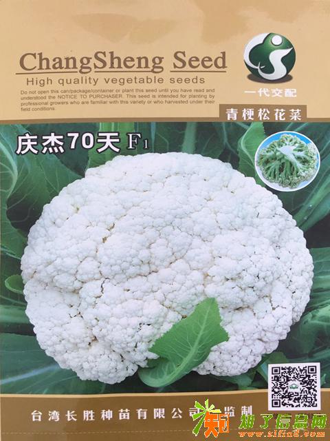 雪松65天青梗松花菜,一代杂交,中早生,植株生长强健,迅速。抗雨耐湿,抗逆性强,栽培容易。花球松大圆整,雪白美观,花梗浅绿色,商品性高。秋播定植后约65-70天采收,单球重约1000g,产量高,春播定植后55天采收,品质优秀,甜脆味美,市场畅销,是中早生青梗送花型花菜最佳品种之一。