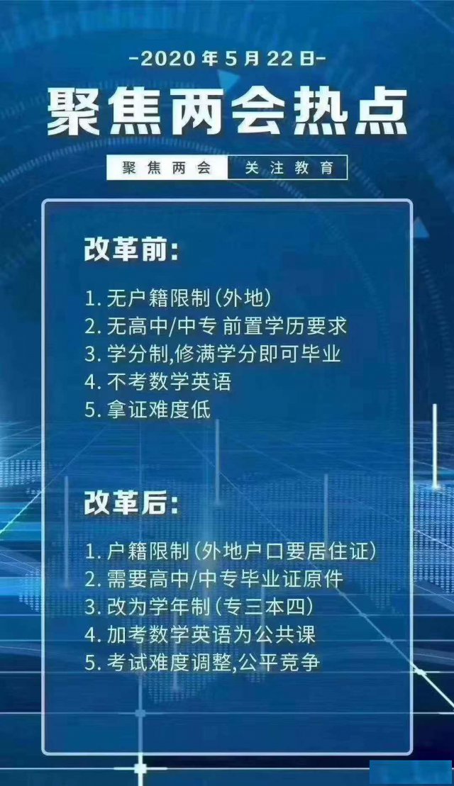 今年两会,教育备受关注。成人高考即将面临改革。在改革前,在高起专中没有高中/中专前置学历要求,学制两年半,采用学分制,修满学分即可毕业,拿证难度低;但是改革后,学制变了,专科三年,本科四年,开始难度调整,增加线上学习等等。所以,早报名,早入学,早毕业,早拿证,