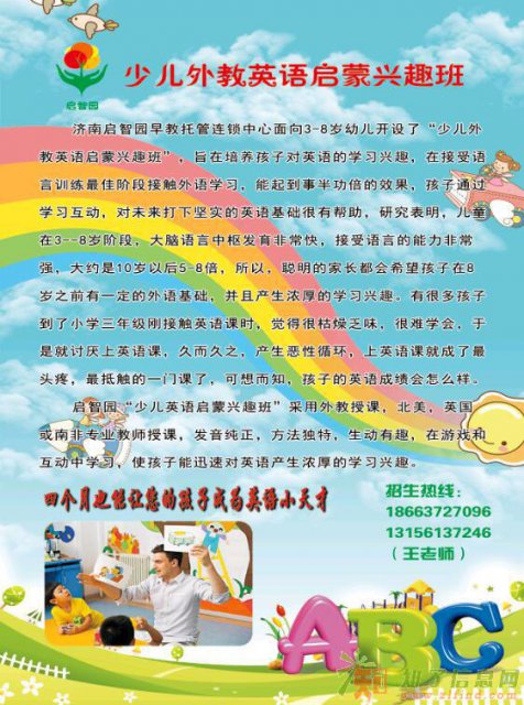 济南启智园早教托管连锁中心面向岁幼儿开设了,旨在培养孩子对英语的学习兴趣,在接受语言训练最佳阶段接触外语学习,能起到事半功倍的效果,孩子通过学习互动,对未来打下坚实的英语基础很有帮助,研究表明,儿童在岁阶段,大脑语言中枢发育非常快,接受语言的能力非常强,大约是10岁以后5倍,所以,聪明的家长都会希望孩子在8岁之前有一定的外语基础,并且产生浓厚的学习兴趣。有很多孩子到了小学三年级刚接触英语课时,觉得很枯燥乏味,很难学会,于是就讨厌上英语课,久而久之,产生恶性循环,上英语课就成了最头疼,最抵触的一门课了,可想而知,孩子的英语成绩会怎么样。