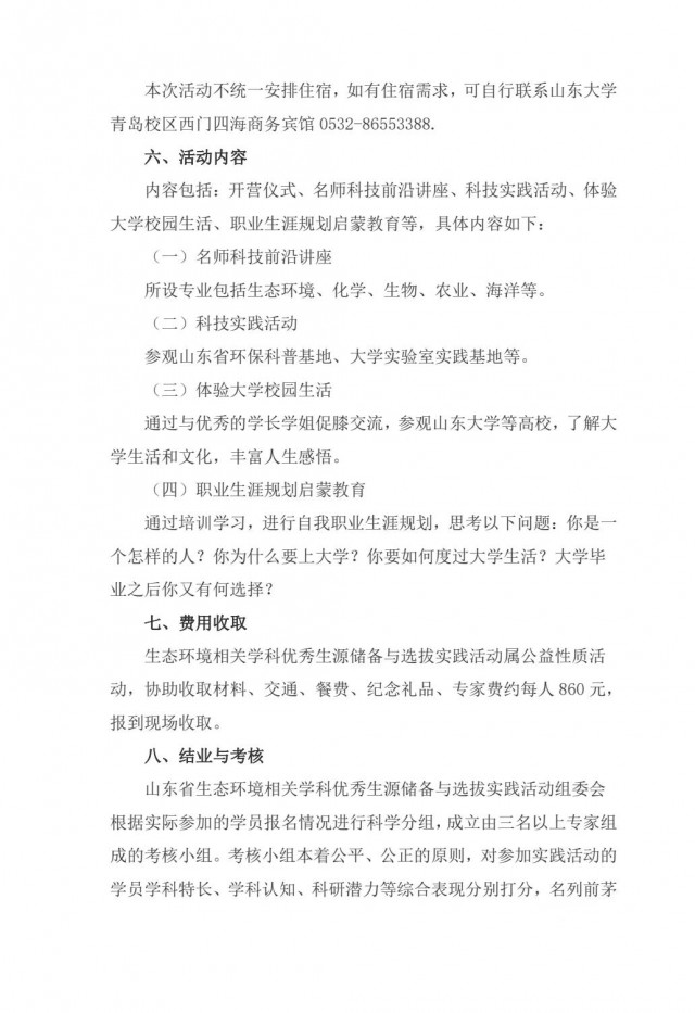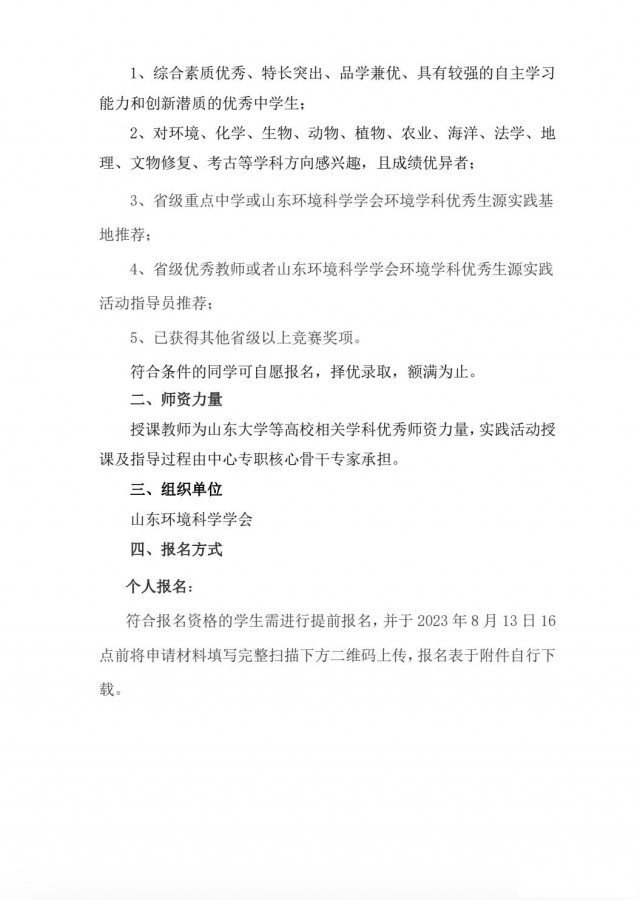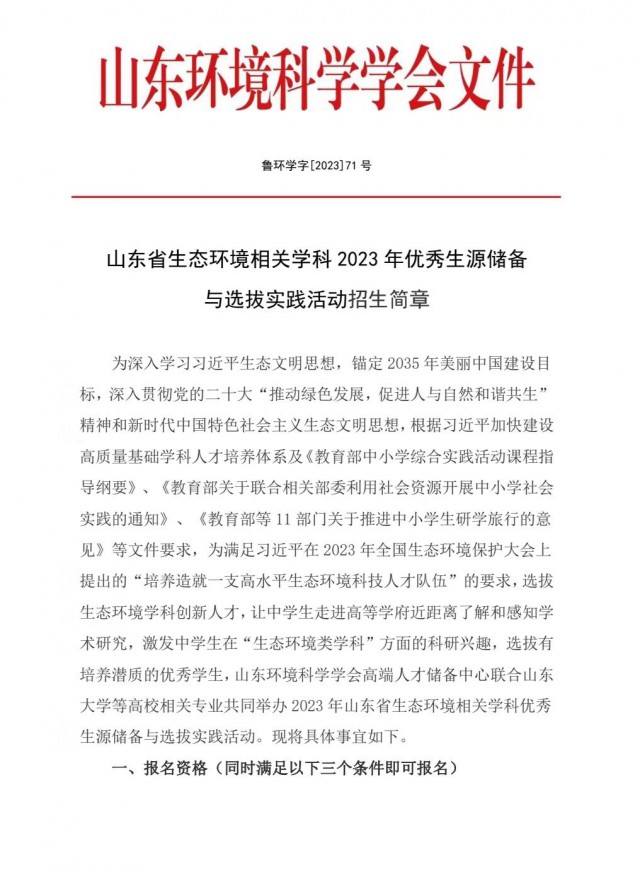 为深入学习生态文明思想,锚定2035年美丽中国建设目标,深入贯彻党的二十大“推动绿色发展,促进人与自然和谐共生”精神和新时代中国特色社会主义生态文明思想,根据加快建设高质量基础学科人才培养体系及《教育部中小学综合实践活动课程指导纲要》、《教育部关于联合相关部委利用社会资源开展中小学社会实践的通知》、《教育部等11部门关于推进中小学生研学旅行的意见》等文件要求,为满足在2023年全国生态环境保护大会上提出的“培养造就一支高水平生态环境科技人才队伍”的要求,选拔生态环境学科创新人才,让中学生走进高等学府近距离了解和感知学术研究,激发中学生在“生态环境类学科”方面的科研兴趣,选拔有培养潜质的优秀学生,山东环境科学学会高端人才储备中心联合山东大学等高校相关专业共同举办2023年山东省生态环境相关学科优秀生源储备与选拔实践活动。