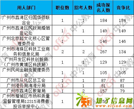 报名通过报名人数前十的职位主要集中在广州市海珠区科技工业商务和信息化局、广州市荔湾区归国华侨联合会、广州市增城区市场和质量监督管理局三个部门,具体信息如下: