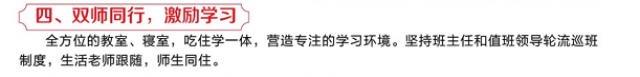 全方位的教室、寝室,吃住学一体,营造专注的学习环境。坚持班主任和值班领导轮流巡班制度,生活老师跟随,师生同住。