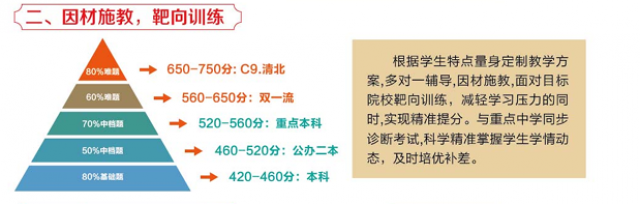根据学生特点量身定制教学方案,多对一辅导,因材施教,面对目标院校靶向训练,减轻学习压力的同时,实现精准提分。与重点中学同步诊断考试,科学精准掌握学生学情动态,及时培优补差。