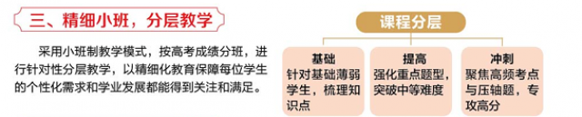 采用小班制教学模式,按高考成绩分班,进行针对性分层教学,以精细化教育保障每位学生的个性化需求和学业发展都能得到关注和满足。