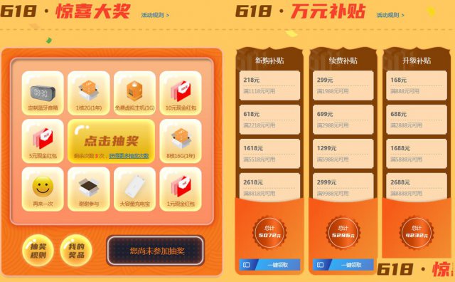 此次活动有一个抽奖板块,不管是新老用户都可以参与抽奖。奖金也非常给力,不仅有蓝牙音箱、高端大容量充电宝、现金红包等礼品,还有1H2G10G3M云服务器和8H16G100G100M超高配置云服务器一年免费使用权限。