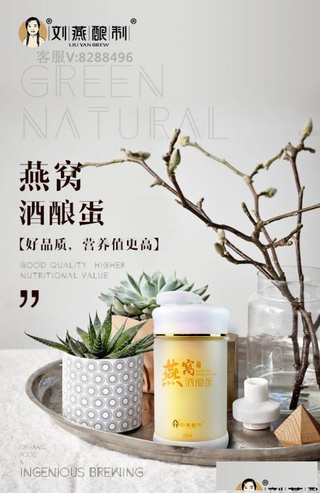 作为一个女性健康食品品牌,刘燕酿制的*刘燕说,女性追求美丽是自然的,但她们应该用健康自然的方式,做到美丽自然。燕窝酒酿蛋精选东南亚进口的宫廷白燕窝,以及泰国的土葛根、有机珍珠糯米、土鸡蛋、姜汁红糖。所有原料均为绿色天然成分。继承古老的酿造方法,结合现代冻干工艺,将燕窝之美与酿造鸡蛋的丰胸效果完美结合,让女性喝一杯燕窝酒酿蛋,可以达到两个保养效果,一举两得!