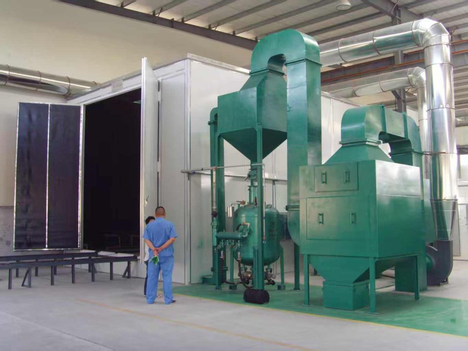 2. 中型量产全自动喷砂房:价格约15万 - 50万元。配置升级为PLC控制的输送式喷砂线、多组协同喷枪、高效布袋除尘系统及自动回砂装置,适配中等尺寸工件,如不粘锅、轮毂、玻璃制品等。