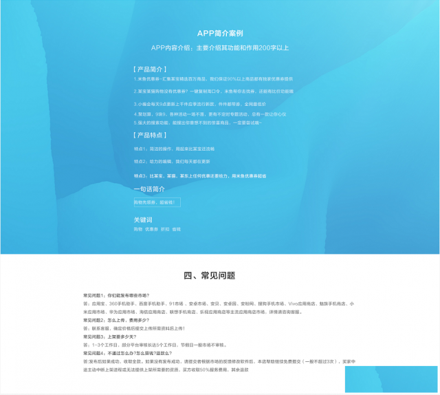 2、准备APP的APK文件、名称、版本号,APP的简介200字左右,一句话简介20字以内,软件截图4-5张等等),适用平台,软件语言(英文、简体中文、繁体中文等等),软件授权(免费、收费、部分收费等),软件类型,软件官网,软件在其他渠道的下载链接,开发者信息(姓名、扣扣、电话、网址等),还要准备和各个市场友链。