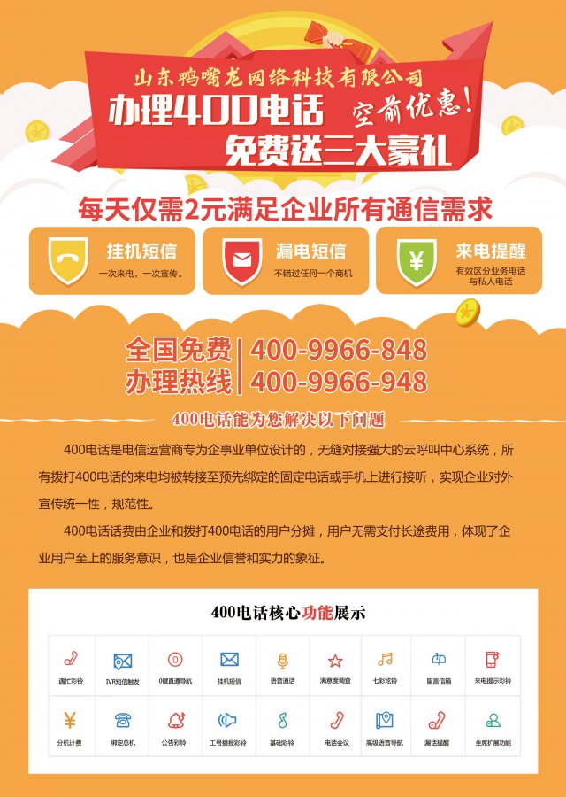 山东鸭嘴龙网络科技有限公司是一家集企业400电话办理、商务彩铃、企业号码认证、商务配音、网站建设、小程序制作等多元化企业服务为一体的综合网络服务公司,本公司秉承以满足更广大的客户需求为己任,坚守“诚信立业,共赢存远”的企业理念与业界朋友建立更广泛、更长远的合作关系。