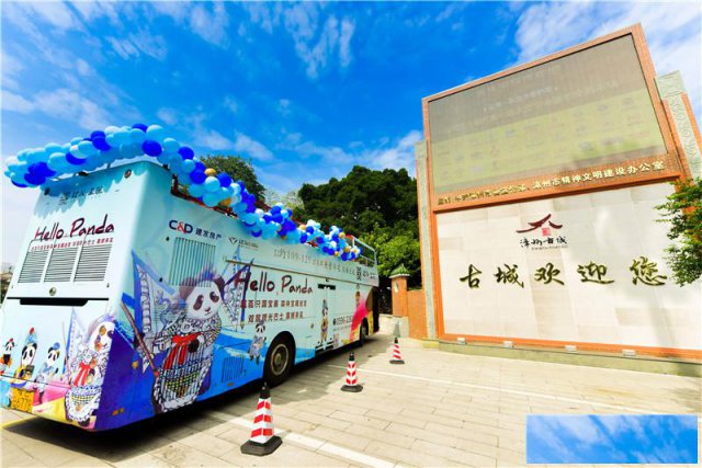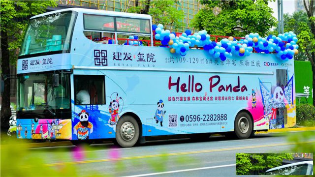 顶层为敞篷游客可站在上层观看风景,具有外观设计新颖的观光巴士车。
