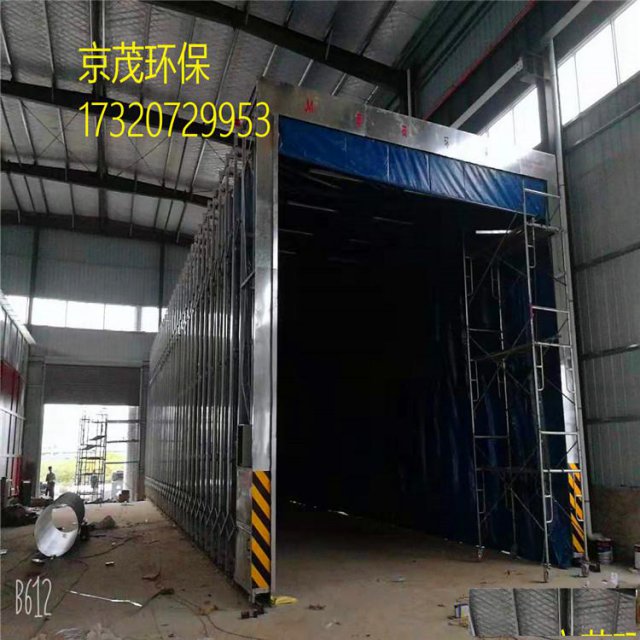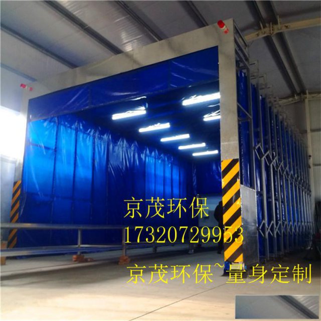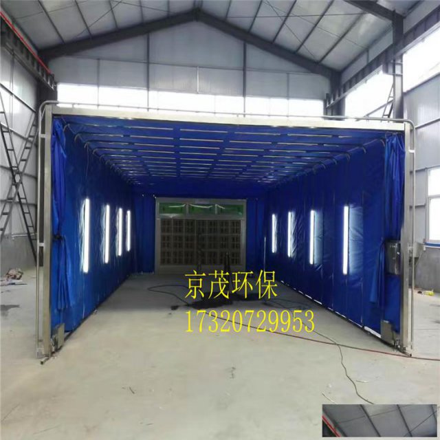 京茂环保大型移动伸缩喷漆房的送风机将新鲜空气从进风口吸入,先通过道滤尘网把空气中的大颗粒灰尘滤去,再进入喷漆房顶部气室,空气流经过顶部过滤棉被过滤干净从顶部均匀地向下流动,在工件四周形成风幕。先通过两侧地棉初滤喷漆过程中的漆雾、杂质;后从排风环保柜,通过过滤棉和活性碳再滤去剩余漆雾、有害气体,经处理后的废气直接从排气口排出房外。大型移动伸缩喷漆房确保室内空气清新,从而达到安全卫生、环保无害的操作环境。