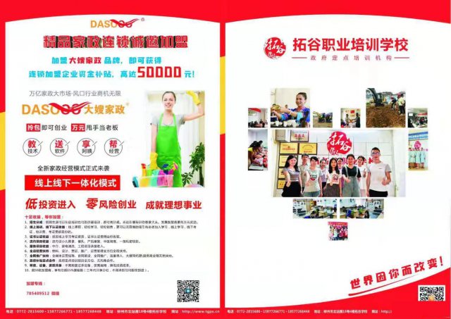 南宁拓谷职业学校是一家集培训、推荐上岗、后期管理为一体的服务公司;其月嫂、催乳师升级的专业培训更是赢得柳州月嫂及催乳师的一致好评,提供专业的催乳师培训、月嫂培训、育婴师培训;是全方位培训中心及推荐上岗服务的公司,精心服务于客户;本着真心、爱心、诚心、放心、耐心服务理念服务客户。 免费培训,包教包会。培训项目;