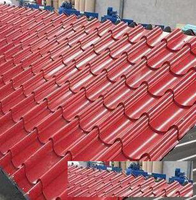 该瓦形状,仿造古琉璃瓦,材料选0.3-0.6厚彩色钢板,色泽丰富,耐腐蚀性强,集轻质,高强,装饰为一体,以柔和的曲线,明显的阶梯,极富立体感地再现了古瓦效果,每平方米重量仅为5-9公斤,是传统烧结瓦的几十分之一。牢固的链接方式完全能承受屋面荷载;特有的空气间层提高了保温隔热性能;瓦自身故有的防水槽具有良好的防水特点,非常适合轻钢结构,混凝土结构,木结构等坡顶建筑或旧城改造中平改坡工程。