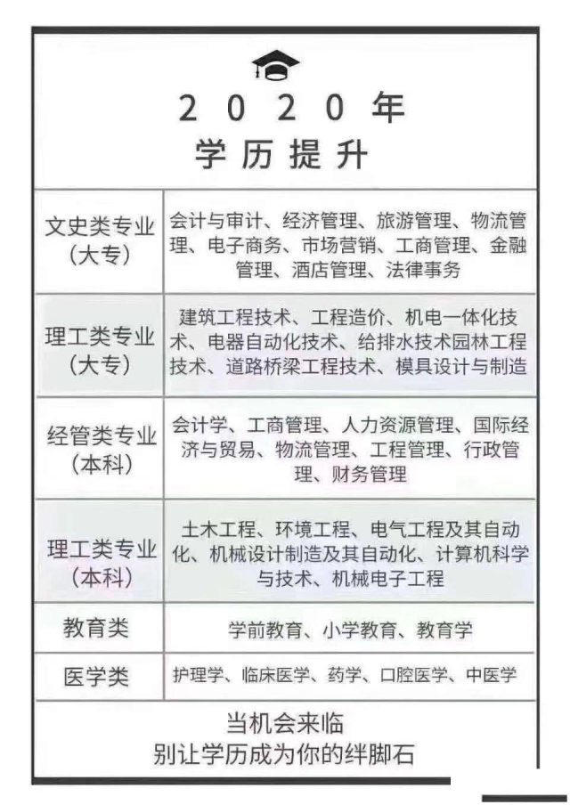 专科:行政管理、电子商务、工商企业管理、行政管理、药学、应用化学技术、计算机信息管理、财务管理、建筑工程技术、酒店管理等专业
