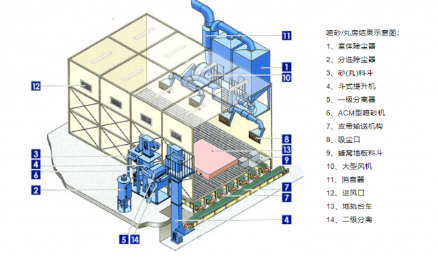 1. 磨料收集装置:喷砂过程中,磨料会散落到底部,需要及时进行收集。常见的磨料收集装置有蜂窝式地板、格栅式地板和刮板输送机等。蜂窝式地板由多个蜂窝状的小斗组成,磨料落入小斗后,通过底部的管道输送到回收系统;格栅式地板则是在地板上设置有格栅,磨料通过格栅落入下方的收集槽中;刮板输送机则是通过刮板将散落的磨料刮送到输送带上,再由输送带将磨料输送到回收系统。